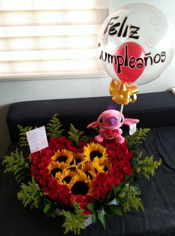 Corazon de 8 girasoles, rosas, peluche y globo