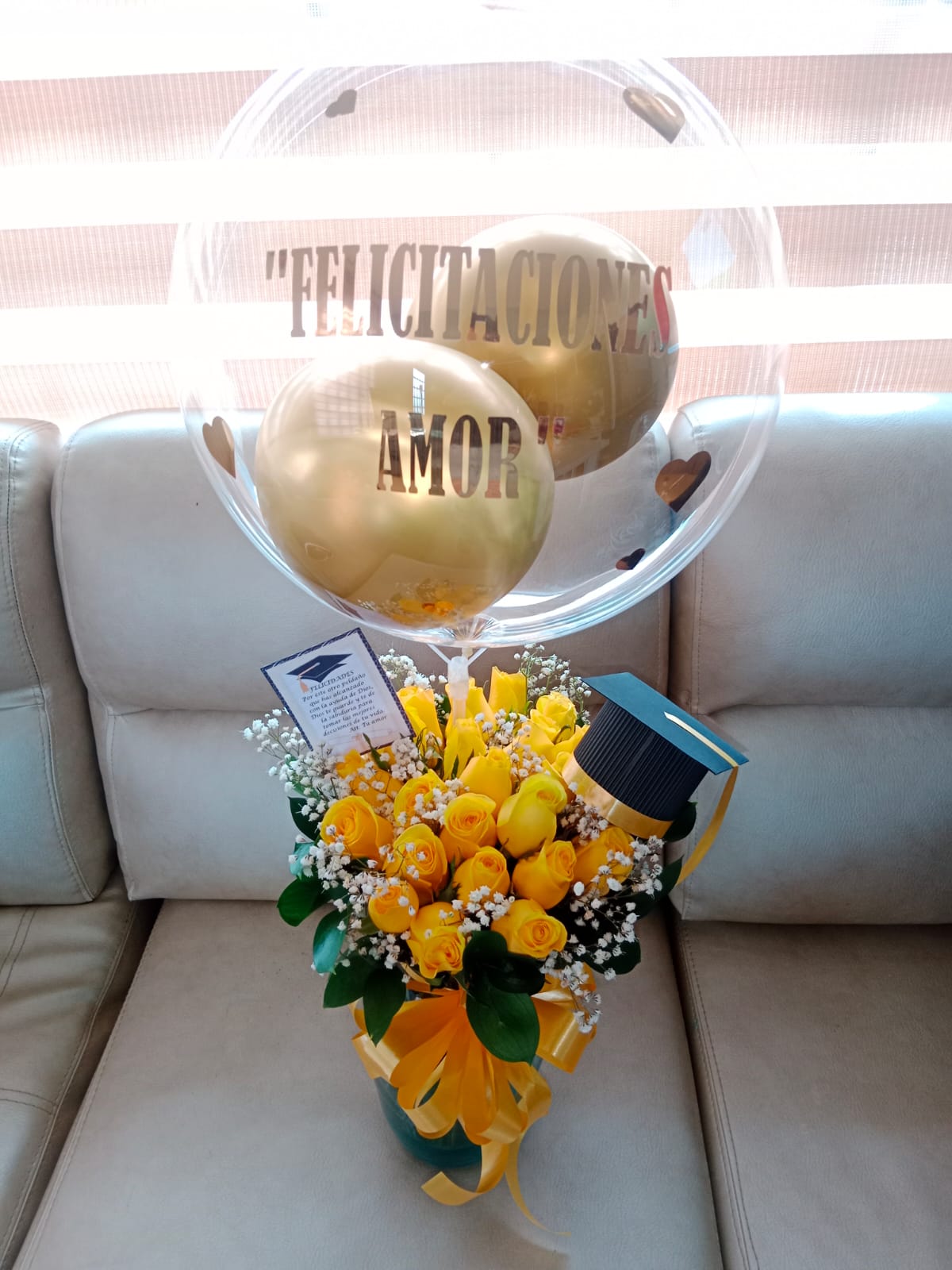 Sé el primero en valorar “Jarrón con 24 rosas, gorro de grado y globo burbuja”